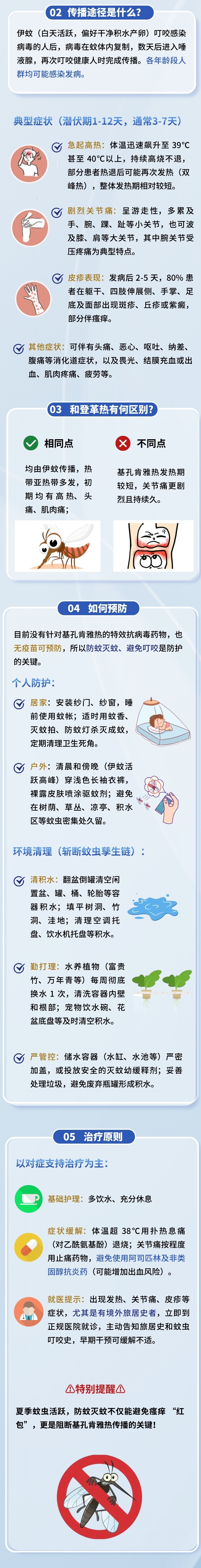 症状:突发高热(>39℃)、严重关节/肌肉痛(可长期)、皮疹等。