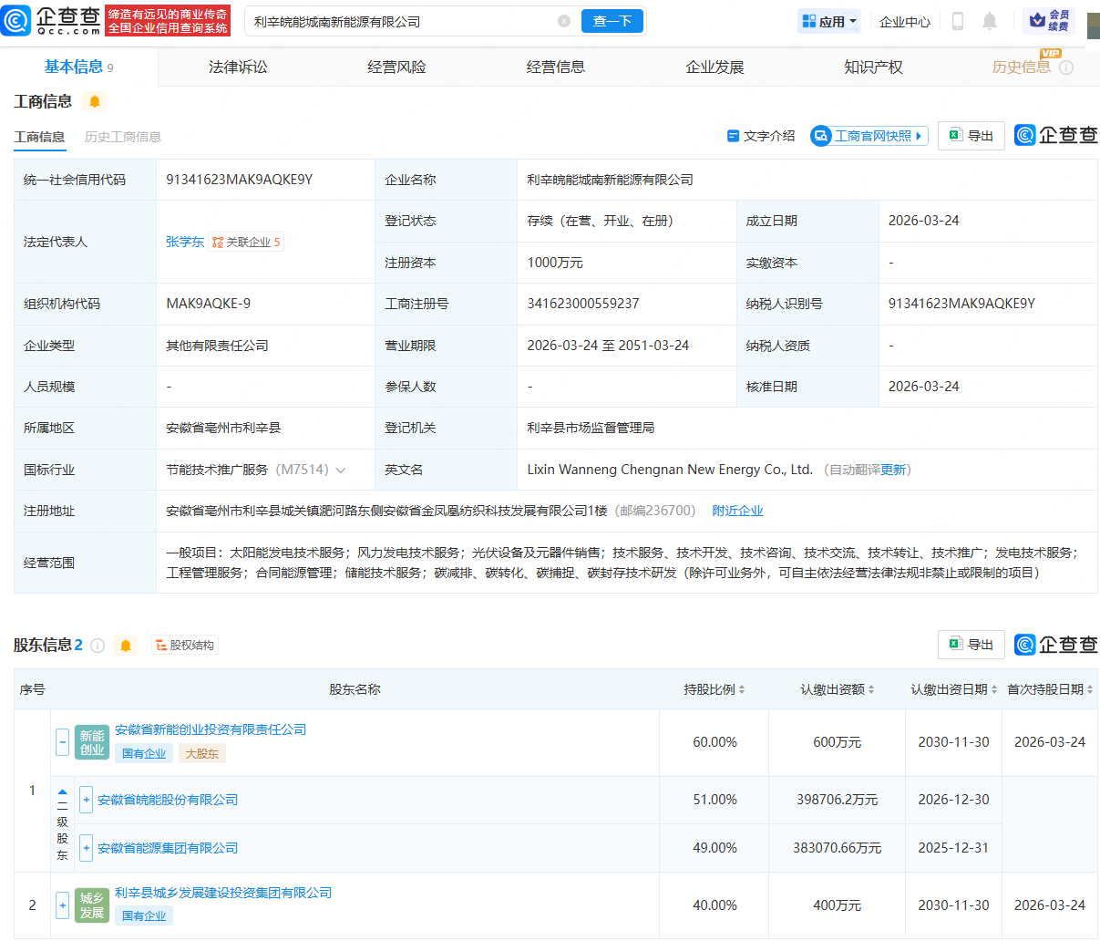 近日,利辛皖能城南新能源有限公司成立,法定代表人为张学东,注册资本为1000万元,经营范围包含:太阳能发电技术服务;风力发电技术服务;光伏设备及元器件销售;储能技术服务等。企查查股权穿透显示,该公司由皖能电力(000543)旗下安徽省新能创业投资有限责任公司、利辛县城乡发展建设投资集团有限公司共同持股。